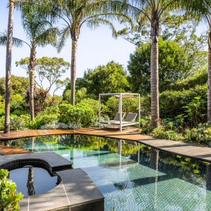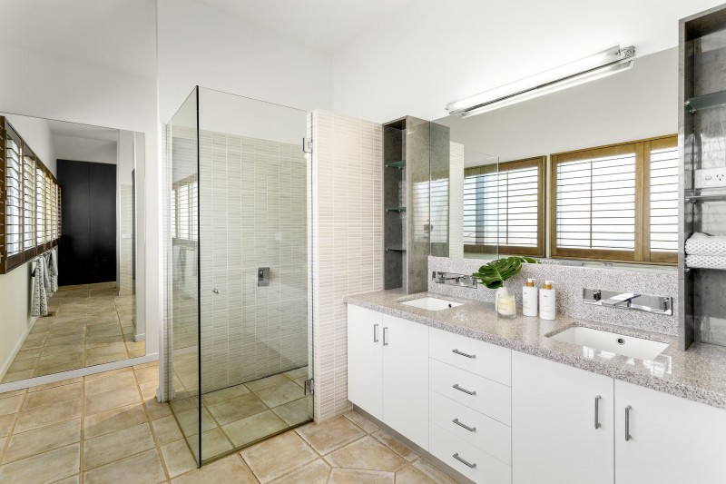 The adjacent living and dining rooms are designed around a cosy open fire place, custom built-in audio visual wall console, hidden bar recess and immediate easy access to the large alfresco terrace ideal for requisite BBQ soirées of any size. From here stand back and absorb the mesmerising aspects of the rear tropical-enthused gardens with tall palms, the pool-side deck and the glistening big blue view of the bay in the distance.