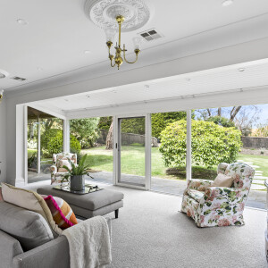 The main entrance is sheltered by a portico verandah inviting you inside to realise a large foyer space and the tastefully curated light-filled interiors anchored by slate flooring and lofty ceilings throughout to great effect.